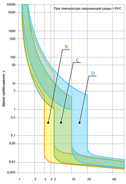 Рассмотрим таблицу отключения автоматического выключателя в зависимости от характеристики отключения: