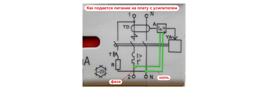 Но, если присмотреться, то можно увидеть, что между дифференциальным трансформатором и поляризованным реле есть дополнительный элемент в виде прямоугольника с буквой «А», обозначение I>. Это та самая электронная плата с усилителем. Кроме того, видно, что к этой плате подходят два провода «фаза» и «ноль» (обозначены на рисунке зеленым цветом снизу). Это как раз и есть тот внешний источник питания, который необходим для полноценной работы такого типа УЗО. Не будет питания, не будет работать и УЗО. Не зависимо от того есть утечка или нет.
