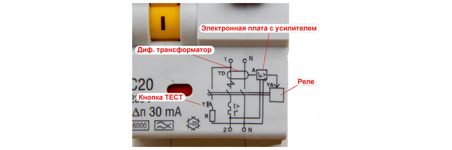 Еще здесь обозначена кнопка ТЕСТ со своим сопротивлением (сопротивление позволяет создать утечку 30мА, безопасный порог для жизни человека). Как видите, в электромеханическом УЗО нет никаких электронных плат и усилителей. Конструкция состоит из одной механики.