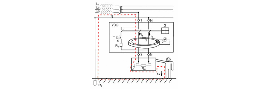 На схеме УЗО изображен человек, который прикосновением к токоведущему проводнику создал ток утечки. Сразу возникла разница между входящим и выходящим током, и когда эта разница достигает 30 мА, дифференциальный трансформатор формирует сигнал на расцепитель, который отключает линию, и сохраняет человеку жизнь.
